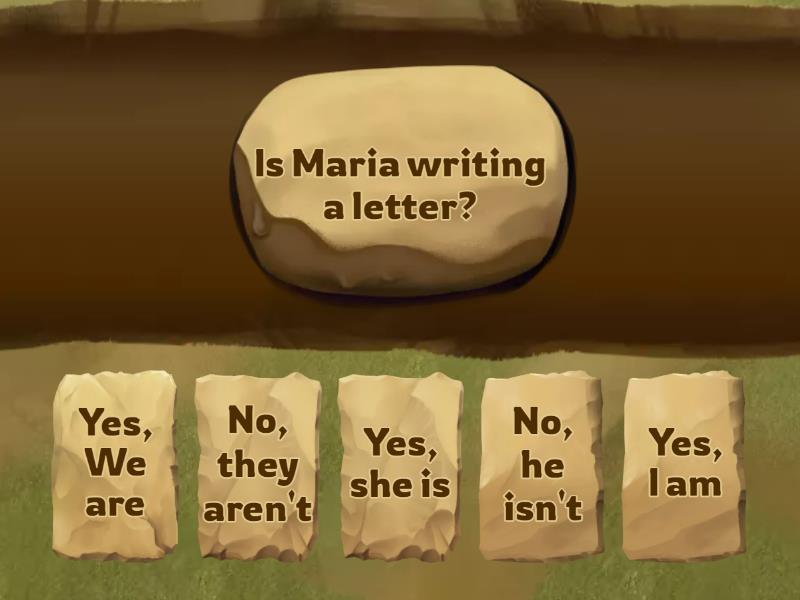 Yes, she is - Is Maria writing a letter?, No, he isn't - Is Luis fixing a car?, Yes, We are - Are we cousins?, No, they aren't - Are they traveling to Spain?, Yes, I am - Are you watching a movie?,