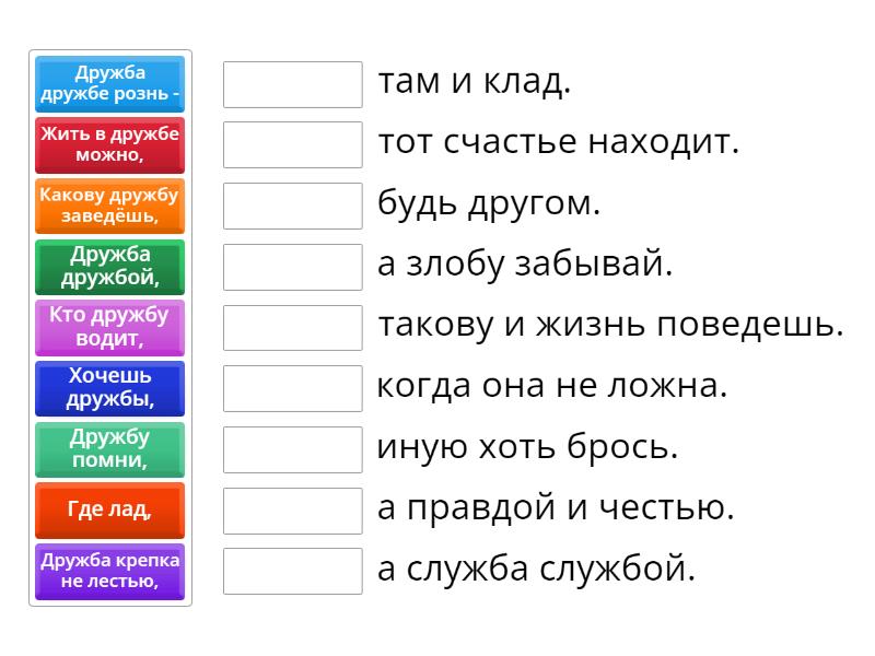 Дружба дружбой,  - а служба службой., Где лад, - там и клад., Дружба дружбе рознь - - иную хоть брось., Дружба крепка не лестью, - а правдой и честью., Жить в дружбе можно, - когда она не ложна., Кто дружбу водит, - тот счастье находит., Хочешь дружбы, - будь другом., Какову дружбу заведёшь, - такову и жизнь поведешь., Дружбу помни, - а злобу забывай.,