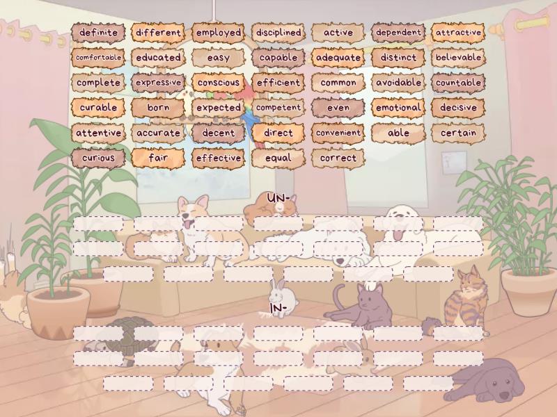 UN-: able, attractive, believable, born, avoidable, certain, comfortable, common, conscious, countable, disciplined, easy, educated, emotional, employed, equal, even, expressive, expected, fair, IN-: accurate, active, adequate, attentive, capable, competent, complete, convenient, correct, curable, curious, decent, decisive, definite, dependent, different, direct, distinct, effective, efficient,