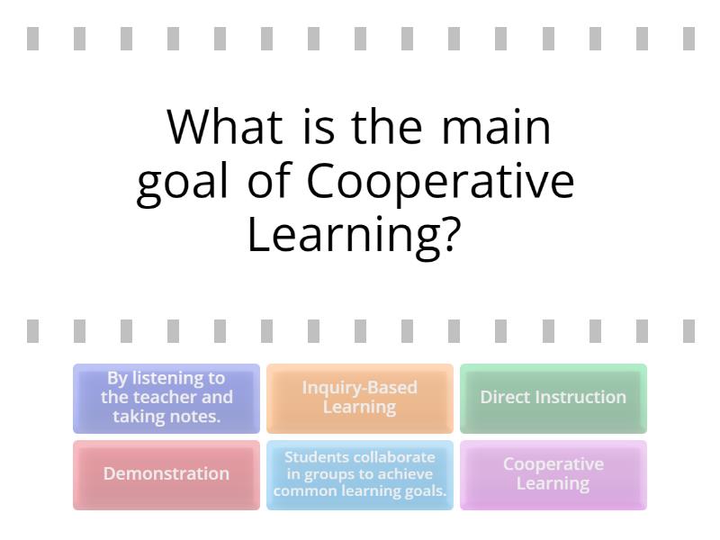 Students collaborate in groups to achieve common learning goals. - What is the main goal of Cooperative Learning?, Demonstration - The teacher explains and shows how to perform a specific task or process., Inquiry-Based Learning - It allows students to explore topics deeply and develop critical thinking skills., Direct Instruction - It provides structured guidance and clear explanations for students., Cooperative Learning - Students collaborate in groups, each contributing to the group's learning process., By listening to the teacher and taking notes. - In the Lecture Method, how do students typically interact with the material?,