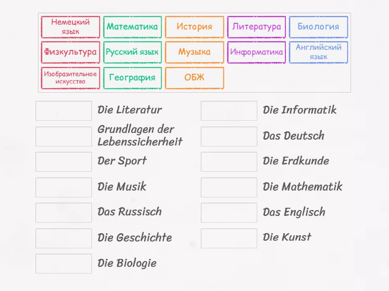 География - Die Erdkunde , Немецкий язык - Das Deutsch , Биология - Die Biologie , Русский язык - Das Russisch , Физкультура - Der Sport , Математика - Die Mathematik , Музыка - Die Musik , Литература - Die Literatur , История - Die Geschichte , Английский язык - Das Englisch , Изобразительное искусство - Die Kunst , Информатика - Die Informatik , ОБЖ - Grundlagen der Lebenssicherheit,