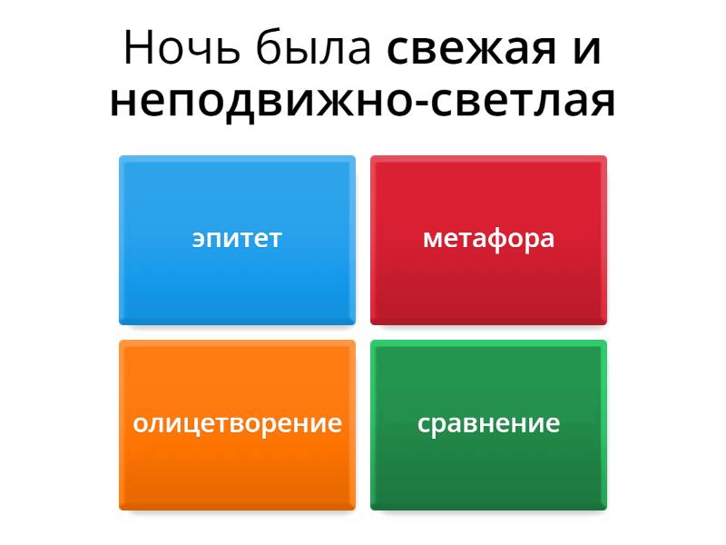 1) Ночь была свежая и неподвижно-светлая a) эпитет b) метафора c) олицетворение d) сравнeние 2) На Красной площади, как сквозь туман веков, неясно вырисовываются очертания башен. a) эпитет b) метафора c) олицетворение d) сравнeние 3) Многоголосо остервенело лают тормоза a) эпитет b) метафора c) олицетворение d) сравнeние 4) Флейта водосточных труб a) эпитет b) метафора c) олицетворение d) сравнeние 5) Поёт зима, аукает, мохнатый лес баюкает a) эпитет b) метафора c) олицетворение d) сравнeние 6) Чумачечая весна a) эпитет b) метафора c) олицетворение d) сравнeние 7) Руки милой - пара лебедей a) сравнение b) метафора c) олицетворение 8) Лес, словно терем расписной a) сравнение b) метафора c) эпитет 9) Роняет лес багряный свой убор a) метафора b) олицетворение c) эпитет 10) Славная осень! Здоровый, ядрёный воздух усталые силы бодрит a) сравнение b) эпитет c) олицетворение 11) Лёд неокрепший на речке студёной словно как тающий сахар лежит a) сравнение b) метафора c) олицетворение 12) Листья поблекнуть ещё не успели - жёлты и свежи лежат, как ковёр a) сравнение b) метафора c) олицетворение 13) Около леса, как в мягкой постели, выспаться можно a) сравнение b) метафора c) олицетворение 14) Не видать конца и края, только синь сосёт глаза a) гипербола b) олицетворение c) метафора 15) Славная осень! Морозные ночи, ясные тихие дни a) эпитет b) метафора c) олицетворение 16) Белая берёза под моим окном принакрылась снегом, точно серебром  a) олицетворение b) эпитет c) метафора 17) Светились чуть медузы облаков a) метафора b) олицетворение c) сравнение 18) Словно ворона веселая, сяду опять на забор! a) олицетворение b) эпитет c) сравнение 19) Мне навстречу, как серёжки, прозвенит девичий смех a) сравнение b) метафора c) олицетворение 20) Невыразимая тишина оглушила нас  a) эпитет b) сравнение c) олицетворение d) гипербола 21) Красавица-весна улыбнулась солнцу a) олицетворение b) сравнение c) метафора d) гипербола 22) Я - никто и ты - никто, вместе мы словно пейзаж  a) сравнение b) олицетворение c) эпитет d) метафора