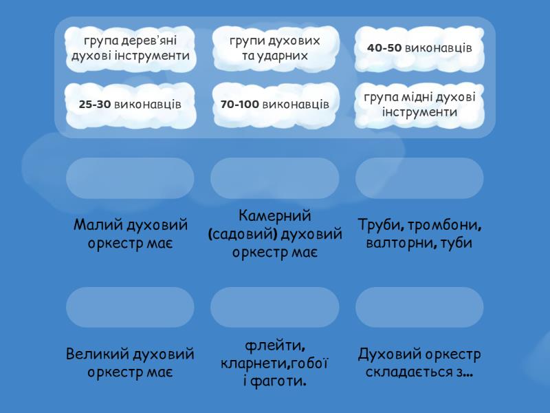 25-30 виконавців - Камерний (садовий) духовий оркестр має, 40-50 виконавців - Малий духовий оркестр має, 70-100 виконавців - Великий духовий оркестр має, групи духових та ударних  - Духовий оркестр складається з..., група мідні духові інструменти - Труби, тромбони, валторни, туби, група дерев’яні духові інструменти - флейти, кларнети,гобої і фаготи.,