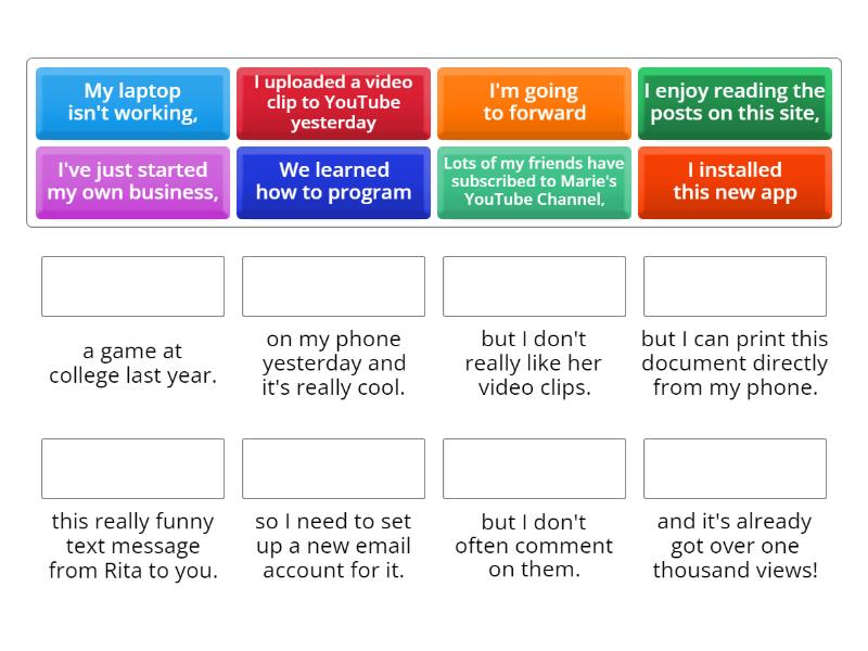 I uploaded a video clip to YouTube yesterday - and it's already got over one thousand views!, I enjoy reading the posts on this site, - but I don't often comment on them., I've just started my own business, - so I need to set up a new email account for it., I installed this new app - on my phone yesterday and it's really cool., Lots of my friends have subscribed to Marie's YouTube Channel, - but I don't really like her video clips., We learned how to program - a game at college last year., I'm going to forward - this really funny text message from Rita to you., My laptop isn't working, - but I can print this document directly from my phone.,