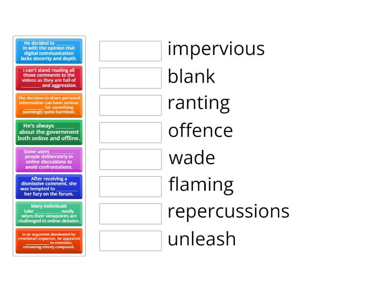 Some users ____________ people deliberately in online discussions to avoid confrontations. - blank, After receiving a dismissive comment, she was tempted to ___________ her fury on the forum. - unleash, He decided to _________ in with the opinion that digital communication lacks sincerity and depth. - wade, The decision to share personal information can have serious ___________ for something seemingly quite harmless. - repercussions, In an argument dominated by emotional responses, he appeared _______________ to emotions, remaining utterly composed. - impervious, Many individuals take ______________ easily when their viewpoints are challenged in online debates. - offence, I can't stand reading all those comments to the videos as they are full of __________ and aggression. - flaming, He's always ________ about the government both online and offline. - ranting,