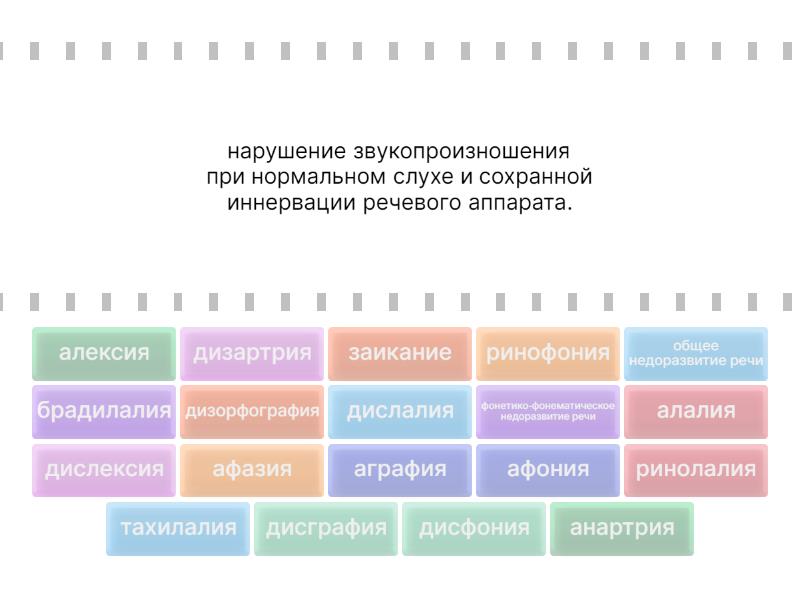 дислалия - нарушение звукопроизношения при нормальном слухе и сохранной иннервации речевого аппарата., ринолалия - нарушения тембра голоса и звукопроизношения, обусловленные анатомо-физиологическими дефектами речевого аппарата., ринофония - носовой оттенок голоса в связи с расстройством функции мягкого нёба и неправильным направлением выдыхаемой струи., анартрия - полное или частичное отсутствие возможности звукопроизношения в результате паралича речедвигательных мышц., дизартрия - нарушение произносительной стороны речи, обусловленное недостаточностью иннервации речевого аппарата., афония - отсутствие фонации (при сохранности шепотной речи) вследствие патологических изменений голосового аппарата., дисфония - расстройство фонации вследствие патологических изменений голосового аппарата., заикание - нарушение темно-ритмической организации речи, обусловленное судорожным состоянием мышц речевого аппарата., брадилалия - патологически замедленный темп речи., тахилалия - патологически ускоренный темп речи., алалия - отсутствие или недоразвитие речи вследствие органического поражения речевых зон коры головного мозга во внутриутробном или раннем периоде развития ребенка., афазия - полная или частная утрата речи, обусловленная локальными поражениями головного мозга., алексия - полная неспособность или потеря способности овладения процессом чтения., дислексия - частичное специфическое нарушение процесса чтения, обусловленное несформированностъю (нарушением) высших психических функций и проявляющееся в повторяющихся ошибках стойкого характера., аграфия - полная неспособность или потеря способности овладения процессом письма., дисграфия - частичное нарушение процесса письма, проявляющееся в стойких, повторяющихся ошибках, обусловленных несформированностью высших психических функций, участвующих в процессе письма., дизорфография - стойкая и специфическая несформированность (нарушение) усвоения орфографических знаний, умений и навыков, обусловленная недоразвитием ряда неречевых и речевых психических функций., фонетико-фонематическое недоразвитие речи - нарушение процессов формирования произносительной системы родного языка у детей с различными речевыми расстройствами вследствие дефектов восприятия и произношения фонем., общее недоразвитие речи - различные сложные речевые расстройства, при которых нарушено формирование всех компонентов речевой системы, относящихся к звуковой и смысловой стороне.,