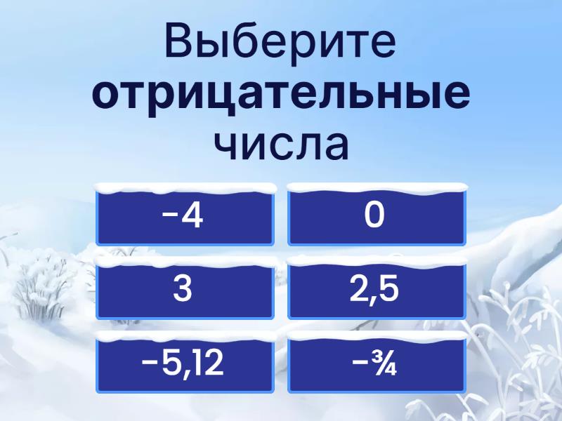 1) Выберите отрицательные числа a) -4 b) 0 c) 3 d) 2,5 e) -5,12 f) -¾ 2) Если у прямой есть начало отсчета, единичный отрезок и положительное направление, то такая прямая... a) положительная b) отрицательная c) единичная d) координатная e) дополнительная f) является лучом 3) Выберите координату точки A на координатной прямой (ед. отрезок 1 клетка) a) -1 b) -2 c) -3 d) -4 e) -5 f) -6 4) Выберите координату точки B на координатной прямой (ед. отрезок 4 клетки) a) 0,25 b) -2 c) -3 d) 1 e) 2 f) 0,5 5) Определите температуру на термометре a) -15ºC b) -10ºC c) -5ºC d) 5ºC e) 10ºC f) 15ºC