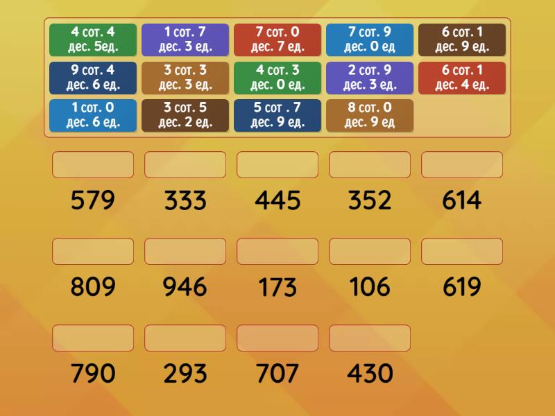 3 сот. 5 дес. 2 ед. - 352, 6 сот. 1 дес. 9 ед. - 619, 1 сот. 0 дес. 6 ед. - 106, 5 сот . 7 дес. 9 ед. - 579, 4 сот. 3 дес. 0 ед. - 430, 7 сот. 0 дес. 7 ед. - 707, 2 сот. 9 дес. 3 ед. - 293, 8 сот. 0 дес. 9 ед - 809, 3 сот. 3 дес. 3 ед. - 333, 9 сот. 4 дес. 6 ед. - 946, 4 сот. 4 дес. 5ед. - 445, 7 сот. 9 дес. 0 ед - 790, 6 сот. 1 дес. 4 ед. - 614, 1 сот. 7 дес. 3 ед. - 173,