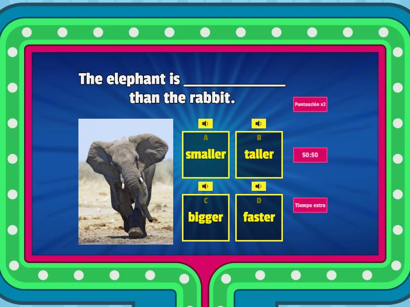 1) The elephant is ______________ than the rabbit. a) smaller b) taller c) bigger d) faster 2) The ant is ______________ than the dog. a) smaller b) bigger c) taller d) longer 3) The giraffe is _____________ than the lion. a) faster b) smaller c) taller d) bigger 4) The snake is ________________ than the worm. a) longer b) faster c) bigger d) taller 5) The car is _____________ than the bike. a) taller b) bigger c) faster d) longer