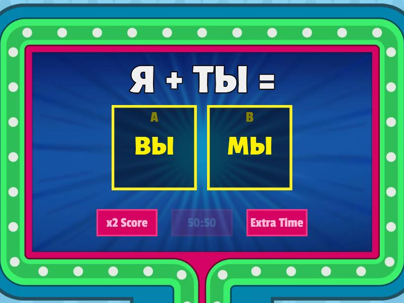 1) Я + ТЫ = a) ВЫ b) МЫ 2) ТЫ + ТЫ = a) ВЫ b) МЫ 3) ОН + ОНА = a) ОНИ b) МЫ 4) ТЫ + ОНА = a) ОНИ b) ВЫ 5) ВЫ + ВЫ = a) ОНИ b) ВЫ 6) ОНИ + ОНИ = a) ОНИ b) ВЫ 7) ТЫ + МЫ = a) ВЫ b) МЫ 8) Я + ТЫ + ОН = a) ВЫ b) МЫ 9) ОН + ТЫ = a) ВЫ b) ОНИ 10) ОН + МЫ a) МЫ b) ОНИ