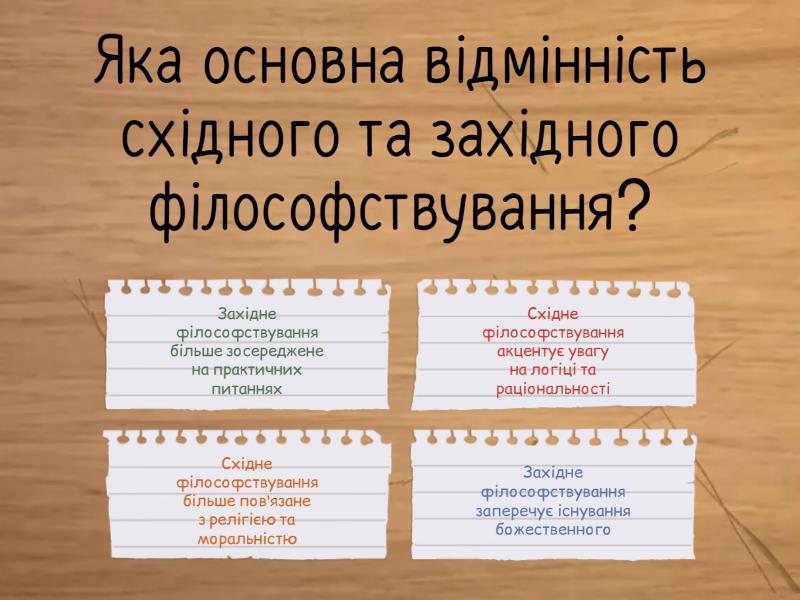 1) Яка основна відмінність східного та західного філософствування? a) Західне філософствування більше зосереджене на практичних питаннях b) Східне філософствування акцентує увагу на логіці та раціональності c) Східне філософствування більше пов'язане з релігією та моральністю d) Західне філософствування заперечує існування божественного 2) Який аспект є характерним для східного філософствування? a) Логічний аналіз буття b) Містичне сприйняття світу c) Раціональне обґрунтування понять d) Скептицизм щодо пізнання істини 3) Яка з наведених концепцій є центральною в індійській філософії? a) Атман b) Логос c) Гілозоїзм d) Діалектика 4) Яка філософська система Стародавньої Індії визнає існування душі та карми? a) Чарвака b) Буддизм c) Софізм d) Стоїцизм 5) До яких текстів звертається індійська філософія як до головного джерела? a) Веди b) Діалоги Платона c) Дао де цзін d) Євангелія 6) Який основний текст конфуціанства? a) «Дао де цзін» b) «Лунь юй» c) «Веди» d) «Нікомахова етика» 7) Яка концепція є ключовою в даосизмі? a) Логос b) Атман c) Дао d) Ейдос 8) Яка школа китайської філософії закликала до суворої правової дисципліни? a) Даосизм b) Конфуціанство c) Легізм d) Буддизм 9) Яке місто вважається колискою західної філософії? a) Афіни b) Олександрія c) Рим d) Вавилон 10) Хто з філософів належав до ранньої античної філософії? a) Парменід b) Сократ c) Арістотель d) Епікур 11) Який філософ стверджував, що першооснова світу — вода? a) Геракліт b) Анаксимен c) Фалес d) Демокріт 12) Яке твердження належить Геракліту? a) «Все тече, все змінюється» b) «Першооснова світу — повітря» c) «Світ побудований з атомів» d) «Ідеї — основа буття» 13) Який філософ вважається засновником діалектичного методу? a) Платон b) Сократ c) Епікур d) Зенон 14) Чому Сократ не залишив жодного письмового твору? a) Він не вмів писати b) Вважав, що істину можна пізнати лише через діалог c) Його роботи були знищені d) Він не займався філософією 15) Яка основна концепція Платона? a) Матерія і форма b) Ідеальний світ ейдосів c) Атоми як основа буття d) Відносність знань 16) Хто був учнем Платона? a) Сократ b) Діоген c) Арістотель d) Епікур 17) Хто з філософів був засновником стоїцизму? a) Епікур b) Зенон із Кітіону c) Гіппократ d) Протагор 18) Яка головна ідея епікурейців? a) Насолода є метою життя b) Світ складається з чотирьох елементів c) Дао є шляхом до істини d) Добродійне життя веде до спасіння 19) Що стверджував неоплатонізм? a) Матерія є ілюзією b) Істина пізнається через єднання з Абсолютом c) Душа смертна і не перевтілюється d) Людина не може пізнати істину 20) Хто є засновником неоплатонізму? a) Плотін b) Геракліт c) Протагор d) Демокріт