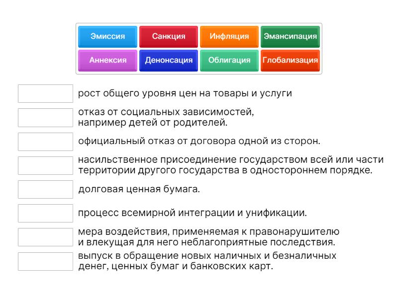 Эмансипация - отказ от социальных зависимостей, например детей от родителей., Эмиссия - выпуск в обращение новых наличных и безналичных денег, ценных бумаг и банковских карт., Аннексия - насильственное присоединение государством всей или части территории другого государства в одностороннем порядке., Инфляция - рост общего уровня цен на товары и услуги, Санкция - мера воздействия, применяемая к правонарушителю и влекущая для него неблагоприятные последствия., Облигация - долговая ценная бумага., Глобализация - процесс всемирной интеграции и унификации., Денонсация - официальный отказ от договора одной из сторон.,