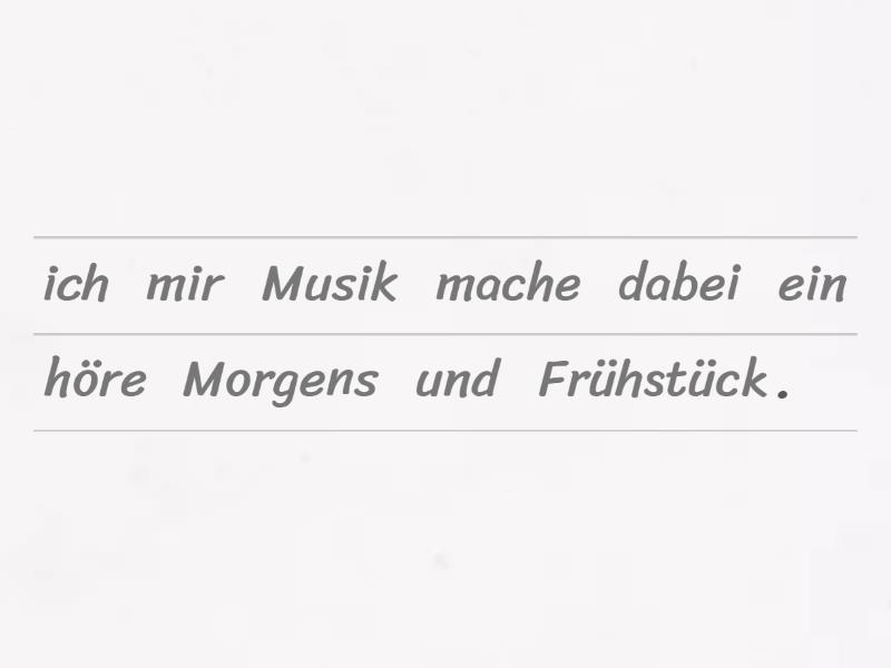 Morgens mache ich mir ein Frühstück und höre dabei Musik., Vormittags arbeite ich im Büro oder lerne für die Prüfung., Mittags gehe ich in ein kleines Restaurant in der Nähe., Nachmittags treffe ich Freunde oder gehe spazieren., Abends koche ich etwas Leckeres und sehe fern., Nachts schlafe ich meistens gut und träume manchmal., Mein Deutschkurs beginnt um 9 Uhr, also komme ich früh., Zuerst mache ich meine Hausaufgaben, dann spiele ich am Handy., Danach esse ich etwas und ruhe mich aus., Schließlich bereite ich mich auf den nächsten Tag vor., Später lese ich ein paar Seiten in meinem Buch., Jede Woche schreibe ich einen kleinen Text auf Deutsch., Jeden Tag übe ich neue Wörter mit einer App., Am Wochenende fahre ich oft zu meinen Eltern., Ich esse immer Frühstück, bevor ich zur Arbeit gehe., Manchmal gehe ich schwimmen, wenn das Wetter schön ist., Selten esse ich Fast Food, weil ich gesund leben will., Ich bin nie zu spät zum Unterricht gekommen., Alle im Kurs wollen die Prüfung machen., Niemand hat heute eine Frage gestellt., Etwas liegt auf deinem Stuhl – ist das dein Schal?, Nichts ist schwer, wenn man jeden Tag ein bisschen übt.,