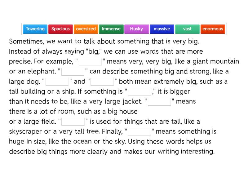 Sometimes, we want to talk about something that is very big. Instead of always saying "big," we can use words that are more precise. For example, "____" means very, very big, like a giant mountain or an elephant. "____" can describe something big and strong, like a large dog. "____" and "____" both mean extremely big, such as a tall building or a ship. If something is "____," it is bigger than it needs to be, like a very large jacket. "____" means there is a lot of room, such as a big house or a large field. "____" is used for things that are tall, like a skyscraper or a very tall tree. Finally, "____" means something is huge in size, like the ocean or the sky. Using these words helps us describe big things more clearly and makes our writing interesting. When something is small, we can use many different words to say exactly what we mean. "____" is often used to describe someone or something small and elegant, like a tiny teacup. "____" means something is smaller than usual, like a small fish. "____" means very weak and small, such as a little twig. "____" means it is so tiny you need a microscope to see it, like a germ. "____" means it is a smaller version of something, like a toy car. "____" is a fun word to say something is very small, like a little bug. These words make it easier to describe small things with precision and creativity. When something is good, there are lots of words to choose from. If someone is "____," it means they are very good at what they do, like a painter or a cook. "____" and "____" also mean very good at something, often naturally. If someone is "____," they are nice to others and care about their feelings. "____" and "____" also mean thinking about others' needs. "____" describes someone who always stands by their friends or family. "____" is used for food that tastes very good, and "____" means it is extra tasty. If food is "____," it is also good for your body. "____," "____," and "____" all mean something is very, very good. Using these words shows exactly what we mean when we say something is good. Sometimes, we need to talk about things that are not good. "____" means very sad or unhappy, like a rainy day when you cannot go outside. "____" and "____" both mean very bad, such as a bad smell or a scary movie. "____" is used when someone does not follow rules, like a naughty child. "____" means someone is not nice, and "____" is used for someone who always wants their way. "____" means very bad, like an evil character in a story. If food is "____," it means it has been cooked too long and does not taste good. "____" means food has no flavour, and "____" means it tastes like nothing. These words help us explain what is bad and why. Instead of always saying "said," we can use other words to be more specific. For example, if someone "____" something, they said it clearly and firmly. "____" means they gave an idea. "____" means they told everyone something important, like good news. If someone "____," it means they said something in a casual way. "____" means they said something quickly, without much detail. "____" means they asked for something strongly, like when you really want something. "____" means they said it loudly, and "____" means they said it very quietly. Using these words makes it easier to understand how something was said. We all have feelings, and there are many words to describe them. "____" means very, very angry, like when someone breaks your toy. "____" is the opposite; it means peaceful and quiet. "____" means surprised, usually by something unexpected. "____" means happy and full of smiles. If someone is "____," they feel shy or silly about something. "____" means they are shy and not very confident. "____" is the opposite; it means they believe in themselves. If someone is "____," they feel sad because something did not go as they hoped. "____" means they feel worried about something, like a test. "____" means very, very sad, like losing a pet. These words help us share how we feel. When people move, there are many ways to describe it. If someone "____," they jumped happily as they walked. If they "____," it means they moved very fast. "____" means they ran away quickly, like when they are scared. If someone "____," it means they walked slowly and calmly. "____" means they walked heavily, like when they are angry. "____" means they walked slowly and tiredly. If someone "____," it means they walked very quietly, like when they do not want to wake a baby. "____" means they moved their feet slowly without lifting them much. "____" means they moved in a lively, bouncy way, like a happy horse. "____" means they moved very quietly and carefully, like sneaking into a room. These words help us describe movement in a fun and detailed way.