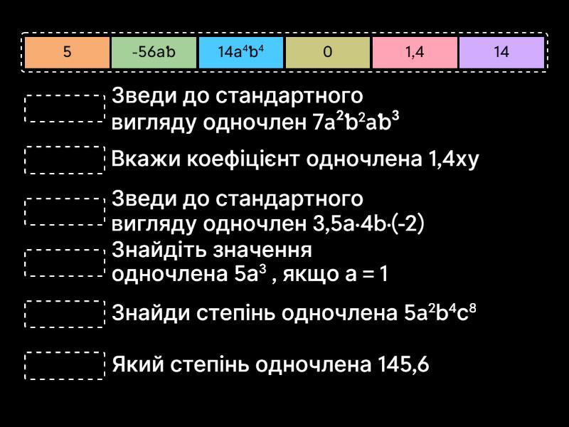14 - Знайди степінь одночлена 5a2b4с8, 0 - Який степінь одночлена 145,6, 1,4 - Вкажи коефіцієнт одночлена 1,4ху, 14а4ƅ4  - Зведи до стандартного вигляду одночлен 7a²ƅ2aƅ³, 5 - Знайдіть значення одночлена 5а3 , якщо а = 1, -56аƅ - Зведи до стандартного вигляду одночлен 3,5а·4b·(-2) ,