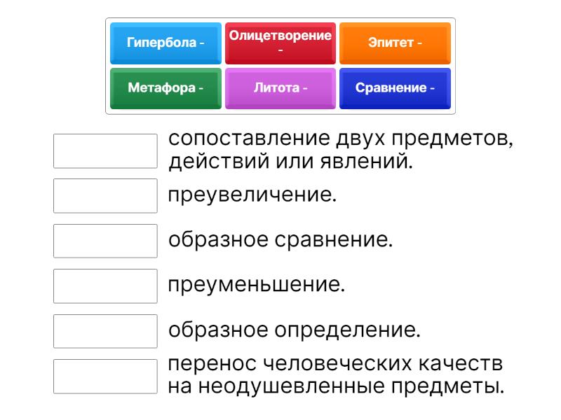 Метафора -  - образное сравнение., Эпитет -  - образное определение., Олицетворение -  - перенос человеческих качеств на неодушевленные предметы., Гипербола -  - преувеличение., Литота -  - преуменьшение., Сравнение -  - сопоставление двух предметов, действий или явлений.,
