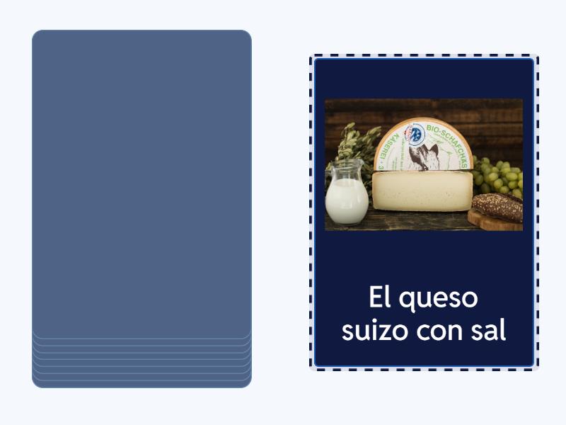El queso suizo con sal , La cerveza alemana sin alcohol, Me gusta el chocolate turco, Me gusta pan frances, Las aceitunas marroquís, El desayuno inglés, Papas con queso, Agua con gas, Voy a tomar agua sin gas con limón.