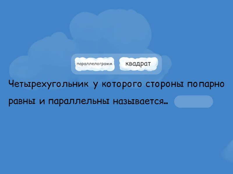 Четырехугольник у которого стороны попарно равны и параллельны называется.. ____ Четырехугольник у которого две стороны параллельны, а две другие нет называется.. ____ Четырехугольник, у которого диагонали равны и точкой пересечения делятся пополам называется... ____ Четырехугольник, у которого диагонали пересекаются под прямым углом называется.. ____
