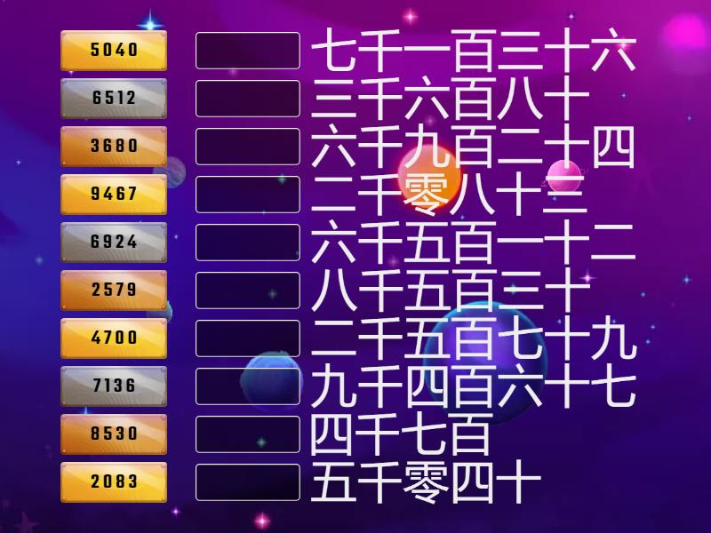 3 6 8 0 - 三千六百八十, 2 0 8 3 - 二千零八十三, 9 4 6 7 - 九千四百六十七, 6 5 1 2  - 六千五百一十二, 2 5 7 9 - 二千五百七十九, 5 0 4 0 - 五千零四十, 7 1 3 6  - 七千一百三十六, 8 5 3 0  - 八千五百三十, 6 9 2 4 - 六千九百二十四, 4 7 0 0 - 四千七百,
