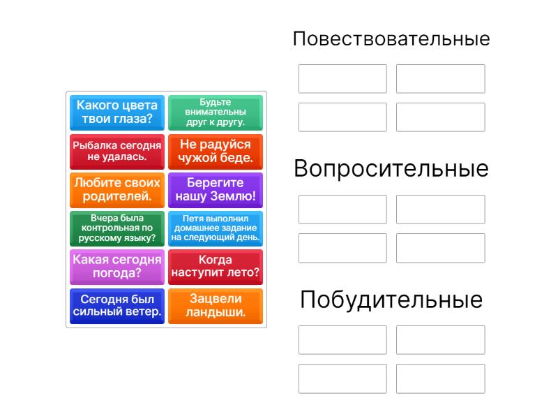 Повествовательные: Сегодня был сильный ветер., Зацвели ландыши., Рыбалка сегодня не удалась., Петя выполнил домашнее задание на следующий день., Вопросительные: Когда наступит лето?, Какого цвета твои глаза?, Вчера была контрольная по русскому языку?, Какая сегодня погода?, Побудительные : Будьте внимательны друг к другу., Берегите нашу Землю!, Не радуйся чужой беде., Любите своих родителей.,