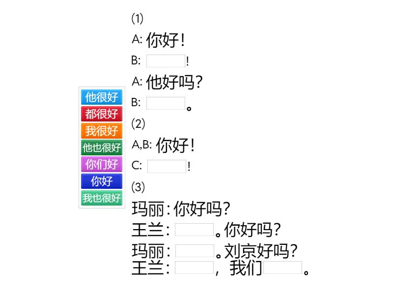 (1) A: 你好! B: ____! A: 他好吗? B: ____。 (2) A,B: 你好! C: ____! (3) 玛丽: 你好吗? 王兰: ____。 你好吗? 玛丽: ____。 刘京好吗? 王兰: ____,我们____。