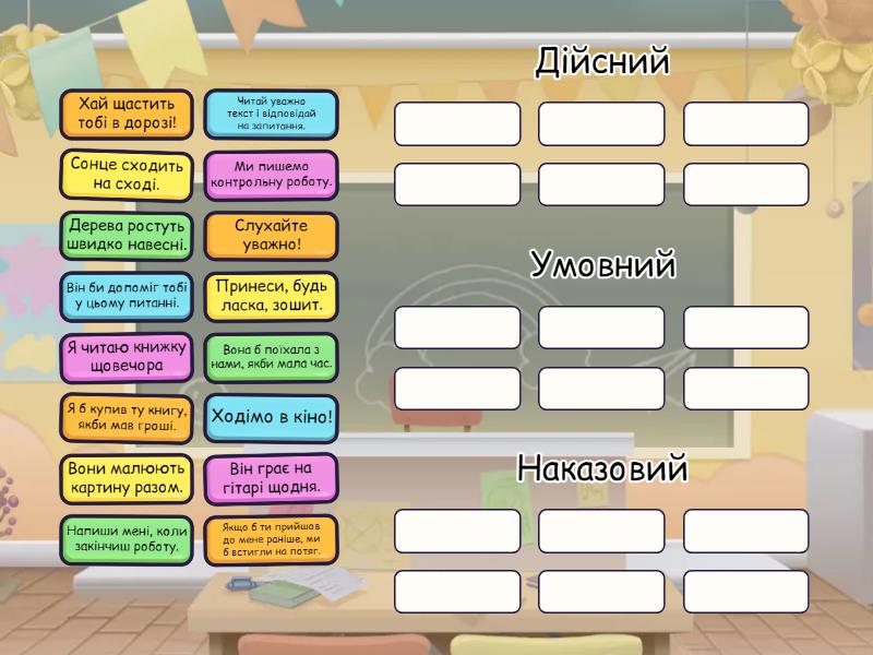 Дійсний: Я читаю книжку щовечора , Ми пишемо контрольну роботу., Сонце сходить на сході. , Він грає на гітарі щодня., Вони малюють картину разом., Дерева ростуть швидко навесні., Умовний: Вона б поїхала з нами, якби мала час., Він би допоміг тобі у цьому питанні., Якщо б ти прийшов до мене раніше, ми б встигли на потяг., Я б купив ту книгу, якби мав гроші., Наказовий: Принеси, будь ласка, зошит., Хай щастить тобі в дорозі!, Слухайте уважно!, Напиши мені, коли закінчиш роботу., Ходімо в кіно!, Читай уважно текст і відповідай на запитання.,