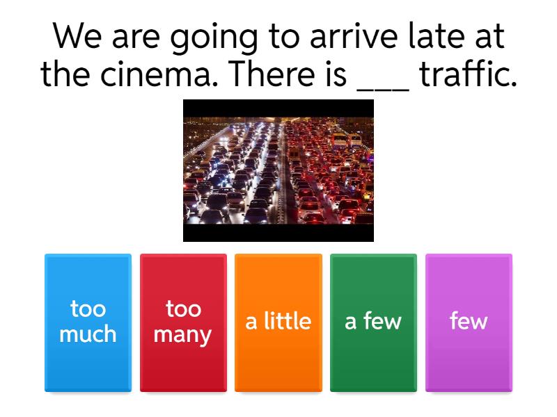 1) We are going to arrive late at the cinema. There is ___ traffic. a) too much b) too many c) a little d) a few e) few 2) The documentary has ___ ideas about how to earn money on line. a) a few b) a little c) lots of d) much e) any 3) I can't go out tonight. I want to save _____ money for a new mobile phone. a) little b) few c) many d) some 4) There are___ students from my school in this show. a) much b) a little c) many d) lots of 5) The doctor in films says we should drink _______ water during the day, especially in summer. a) any b) many c) a lot of d) little 6) The character of the movie has___ real friends. I think he should be more sociable and friendly. a) few b) a few c) many d) a little e) any 7) I want to go to the Loolapalooza! They told me there are ___ tickets left. I have to buy them now! a) many b) a few c) a little d) some e) a lot of 8) My dad is selling his Coldplay tickets and there are____ people interested in it. It is great!!! a) many b) much c) lots of d) little e) few 9) I can't go to the theatre with my little sister. I really don't have_____ patience to be with children. a) many b) any c) much d) a lot of e) a few 10) I have watched this 3D film___ times. I really really love it! a) much b) few c) little d) lots of e) many 11) You can bring an action film for the movie night tonight. I don't have____ a) some b) any c) a few d) a little e) a lot of 12) This series is not very modern but it has got____ great special effects. a) few b) any c) lots of d) a little