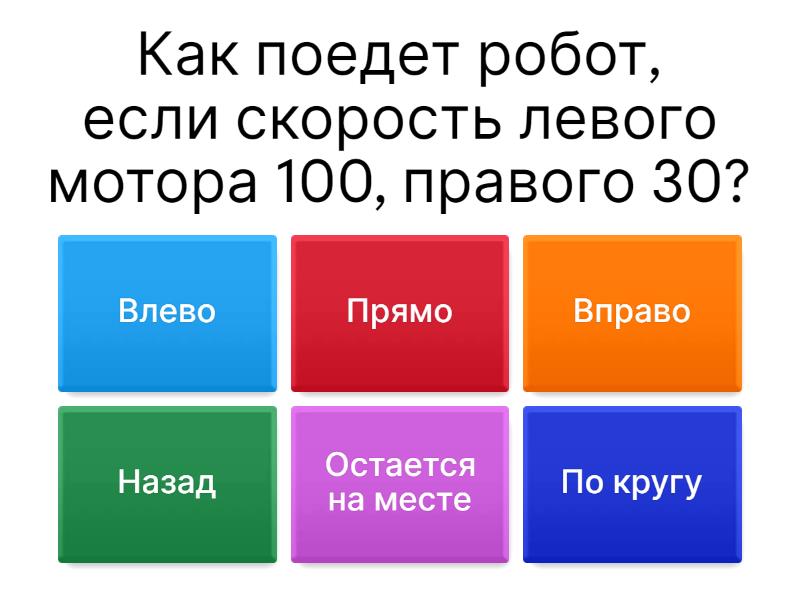 1) Как поедет робот, если скорость левого мотора 100, правого 30? a) Влево b) Прямо c) Вправо d) Назад e) Остается на месте f) По кругу  2) Перечисли способы запрограммировать поворот: a) Один мотор работает вперёд другой назад b) Работает только один мотор c) Один мотор работает медленнее другого d) Моторы не работают e) Оба мотора работают с одинаковой скоростью f) Установлен таймер 3) Для того, чтобы робот ехал вперёд определённое время, нужно использовать команду: a) Таймер b) Начало программы c) Конец программы d) Цикл e) Опустить маркер f) Параллельные задачи 4) Для того, чтобы робот оставлял за собой след, нужно использовать команду a) Опустить маркер b) Поднять маркер c) Энкодер d) Датчик цвета e) Таймер f) Моторы, вперед 5) Что нужно сделать, если робот в программе поворачивает не в нужную сторону: a) Поменять скорости моторов местами b) Повернуть руль в другую сторону 6) Для поворотов робота используется: a) Моторы b) Руль c) Специальная команда 7) Робот ориентируется в пространстве с помощью: a) Человека b) Сенсоров c) Датчиков d) Программы 8) Для того, чтобы робот чертил маркером след не всё время выполнения программы, нужно использовать команду a) Опустить маркер b) Параллельные задачи 9) Значок команды «Моторы, вперед»: a) Желтого цвета b) Фиолетового цвета c) Оранжевого цвета d) Зеленого цвета 10) Значок команды «Опустить маркер»: a) Желтого цвета b) Фиолетового цвета c) Оранжевого цвета d) Зеленого цвета 11) Дисплей в программе TRIK Studio видно: a) В режиме редактора b) В режиме отладки 12) Что такое энкодер a) Датчик движения b) Датчик оборотов c) Датчик угла поворотов 13) Моторы вперед нужны только для движения вперед ? a) Да b) Нет 14) Зачем нужен trik studio a) Чтобы программировать роботов b) Чтобы создавать робота c) Чтобы создавать декорации для роботов