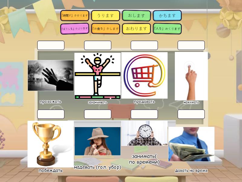 「みちを」あるきます - идти пешком, いそぎます - торопиться, 「ビザが」いります - требоваться, необходимо, うります - продавать, おきます - класть, ставить, 「手紙を」おくります - отправлять, 「人を」おくります - провожать, おします - нажимать, 思い出します - вспоминать, おわります - заканчивать, かえします - возвращать, 「時間が」かかります - занимать( по времени), 「お金を」かします - давать на время, かちます - побеждать, 「ぼうしを」かぶります - надевать (гол. убор),