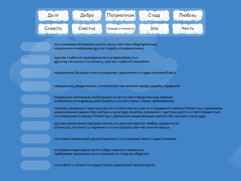 Добро - намеренное, бескорыстное и искреннее стремление к осуществлению блага., Зло - намеренное, умышленное, сознательное причинение вреда, ущерба, страданий, Совесть - способность личности осуществлять моральный самоконтроль, Долг - понимание человеком необходимости вести себя определенным образом и обязанности индивида действовать в соответствии с этими требованиями, Гражданственность - понятие, связанное с чувством долга и ответственностью по отношению к своему Отечеству, с уважением национальных ценностей, святынь и культуры.понятие, связанное с чувством долга и ответственностью по отношению к своему Отечеству, с уважением национальных ценностей, святынь и культуры., Патриотизм - высшее проявление гражданственности, высокое чувство любви, преданности Отечеству, готовность подчинить его интересам свои частные интересы, Честь - осознание индивидом своего общественного значения и требование признания этого значение со стороны общества, Стыд - это осознание человеком своего несоответствия общепринятым нормам или ожиданиям других людей, осознание вины., Счастье - состояние наивысшей удовлетворённости условиями своего существования, Любовь - чувство глубокой привязанности и устремлённость к другому человеку или объекту, чувство глубокой симпатии,