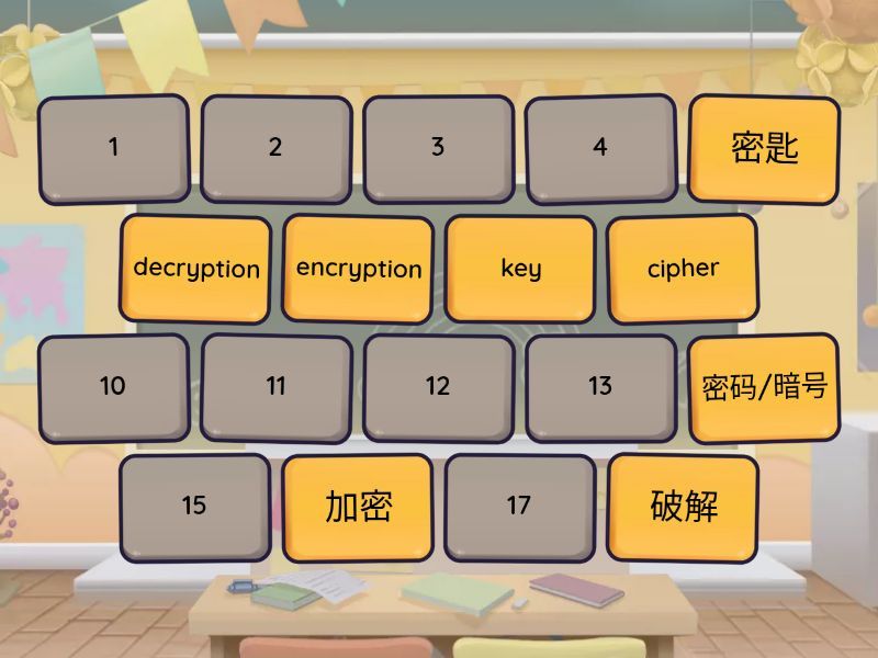 key - 密匙, cipher - 密码/暗号, encryption - 加密, decryption - 破解, enigma machine - 恩尼格玛密码机, code - 代码, cryptography - 密码学, plaintext - 明文, ciphertext - 密文,