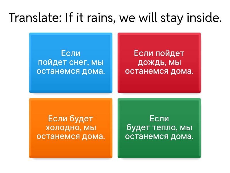 1) Translate: If it rains, we will stay inside. a) Если пойдет снег, мы останемся дома. b) Если пойдет дождь, мы останемся дома. c) Если будет холодно, мы останемся дома. d) Если будет тепло, мы останемся дома. 2) Translate: If she calls, tell her I'm busy. a) Если она уйдет, скажи, что я занят. b) Если она позвонит, скажи, что я занят. c) Если она придет, скажи, что я занят. d) Если она напишет, скажи, что я занят. 3) Translate: If you study, you will pass the exam. a) Если ты будешь спать, ты сдашь экзамен. b) Если ты будешь играть, ты сдашь экзамен. c) Если ты будешь гулять, ты сдашь экзамен. d) Если ты будешь учиться, ты сдашь экзамен. 4) Translate: If they arrive early, we will start the meeting. a) Если они приедут рано, мы начнем встречу. b) Если они приедут вовремя, мы начнем встречу. c) Если они приедут поздно, мы начнем встречу. d) Если они приедут завтра, мы начнем встречу. 5) Translate: If you are tired, go to bed. a) Если ты голоден, иди спать. b) Если ты рад, иди спать. c) Если ты устал, иди спать. d) Если ты грустен, иди спать. 6) Translate: If I find your book, I will return it. a) Если я найду твою ручку, я верну её. b) Если я найду твою книгу, я верну её. c) Если я найду твою шляпу, я верну её. d) Если я найду твою сумку, я верну её. 7) Translate: If the sun shines, we will go to the beach. a) Если будет ветер, мы поедем на пляж. b) Если будет снег, мы поедем на пляж. c) Если будет дождь, мы поедем на пляж. d) Если будет солнце, мы поедем на пляж. 8) Translate: If you need help, ask me. a) Если тебе нужна вода, спроси меня. b) Если тебе нужна помощь, спроси меня. c) Если тебе нужна еда, спроси меня. d) Если тебе нужна книга, спроси меня. 9) Translate: If we finish early, we will watch a movie. a) Если мы закончим рано, мы посмотрим фильм. b) Если мы закончим сейчас, мы посмотрим фильм. c) Если мы закончим завтра, мы посмотрим фильм. d) Если мы закончим поздно, мы посмотрим фильм. 10) Translate: If you are hungry, eat something. a) Если ты грустен, съешь что-нибудь. b) Если ты рад, съешь что-нибудь. c) Если ты устал, съешь что-нибудь. d) Если ты голоден, съешь что-нибудь.