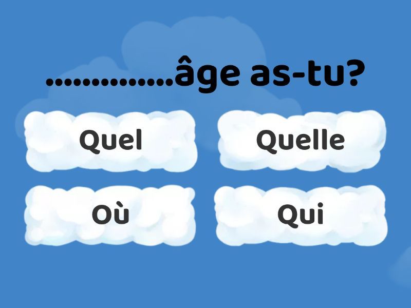 1) ..............âge as-tu? a) Quel b) Quelle c) Où d) Qui 2) ..............habites-tu? a) Quel b) Quelle c) Où d) Qui 3) ..............est ton adresse? a) Quel b) Quelle c) Où d) Qui 4) ..............est ta nationalité? a) Quel b) Quelle c) Où d) Qui 5) ..............est ta profession? a) Quel b) Quelle c) Où d) Qui 6) ..............est ton prénom? a) Quel b) Quelle c) Où d) Qui 7) ..............est absent? a) Quel b) Quelle c) Où d) Qui 8) ..............va à l'école? a) Quel b) Quelle c) Où d) Qui 9) ..............est-ce? a) Quel b) Quelle c) Où d) Qui 10) ..............ça va? a) Comment b) Quelle c) Où d) Qui 11) ..............tu t'appelles? a) Comment b) Quelle c) Où d) Qui 12) ..............tu es né? a) Comment b) Quelle c) Quand d) Qui 13) ..............est ton anniversaire? a) Quand b) Quelle c) Combien de d) Qui 14) ..............garçons sont dans la classe? a) Quand b) Quelle c) Combien de d) Qui 15) ..............livres tu as dans le cartable? a) Quand b) Quelle c) Combien de d) Qui