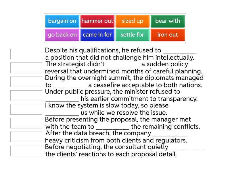 iron out - Before presenting the proposal, the manager met with the team to __________ the remaining conflicts., bear with - I know the system is slow today, so please __________ us while we resolve the issue., sized up - Before negotiating, the consultant quietly __________ the clients’ reactions to each proposal detail., settle for - Despite his qualifications, he refused to __________ a position that did not challenge him intellectually., came in for - After the data breach, the company __________ heavy criticism from both clients and regulators., bargain on - The strategist didn’t __________ a sudden policy reversal that undermined months of careful planning., go back on - Under public pressure, the minister refused to __________ his earlier commitment to transparency., hammer out - During the overnight summit, the diplomats managed to __________ a ceasefire acceptable to both nations.,