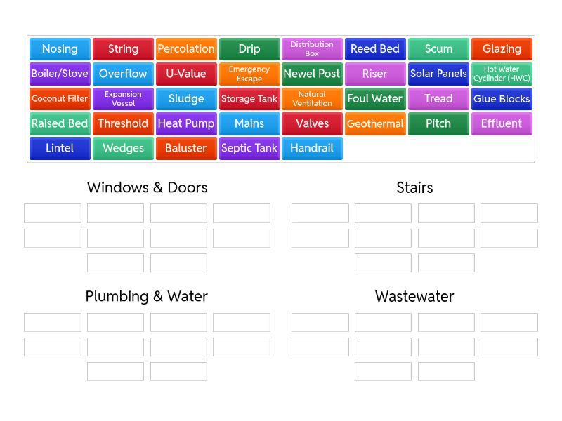 Windows & Doors: Lintel, Threshold, Glazing, U-Value, Emergency Escape, Natural Ventilation, Drip, Stairs: Handrail, Baluster, Newel Post, Tread, Riser, Pitch, String, Nosing, Glue Blocks, Wedges, Plumbing & Water: Solar Panels, Storage Tank, Valves, Hot Water Cyclinder (HWC), Mains, Overflow, Geothermal, Boiler/Stove, Heat Pump, Expansion Vessel, Wastewater: Foul Water, Percolation, Septic Tank, Distribution Box, Raised Bed, Sludge, Scum, Effluent, Reed Bed, Coconut Filter,