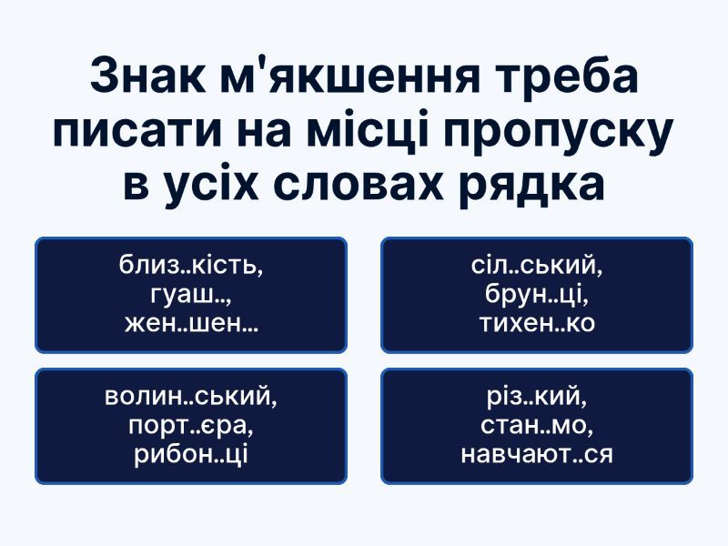 1) Знак м'якшення треба писати на місці пропуску в усіх словах рядка a) близ..кість, гуаш.., жен..шен... b) сіл..ський, брун..ці, тихен..ко c) волин..ський, порт..єра, рибон..ці d) різ..кий, стан..мо, навчают..ся 2) Помилку в написанні слова допущено в рядку a) сядьмо, чотирма, гіркий b) жінчин, неньчин, слизький c) рибалчин, ляльчин, доньчин d) Умань, уманьський, запорізький 3) Знак м'якшення не треба писати в усіх словах рядка a) тон..ший, таріл..ці, красун..чик, ковз..кий b) рибал..ці, піс..ня, Натал..чин, т..мяний c) він..єтка, в..йокати, лл..є, Хар..ків d) мен..ший, батал..йон, Ігор.., Гет..манщина 4) Знак м’якшення треба писати на місці пропуску в усіх словах рядка a) брун..ці, рибал...ство, промін..ці b) запоріз..кий, дивуєт..ся, тон...ший c) порад..те, пан..ський, жмен..ці d) пал..ці, доглян..те, посол..ський 5) Позначте рядок, у якому всі слова пишуться з м'яким знаком a) крад..кома, ослін..чик, виріз..блений, мал..ва b) волос..кий, дівчинон..ці, зац..вірінькати, воєначал..ник c) ган..бити, ковал..ський, лос..йон, вигул..кнути d) консул..ський, буд..те, вит..охкувати, задзелен..чати 6) М'який знак на місці пропуску реба писати в усіх словах рядка a) перелаз..те, стежин..ці, памороз.. b) уман..ський, люд..ми, пісен..ці c) л..лється, поглян..те, гір..кий d) волос..кий, брун..ці, різ..блення 7) Познач рядок, у кожному слові якого пишемо знак м’якшення a) Займаєш…ся, боїш…ся, одягаєш…ся, прокидаєш…ся b) Обливаєш…ся, спиняєш…ся, знаєш…ся, спізниш…ся c) Прокидаєт…ся, здаєт…ся, вчит…ся, знаєт…ся 8) М’який знак на місці пропуску НЕ пишеться в усіх словах рядка a) батал…йон, ремін…чик, Гор…кий, він…ця. b) кружал…це, граєш…ся, сміют…ся, кобзар… c) л…лєш, жен…шень, нян…чити, спіл…ник d) уман…ський, мен…ший, сопіл…ці, кур…йозний 9) Позначте рядок, у якому в усіх словах пишеться м'який знак a) піс..няр, ялинон..ці, батал..йон b) у скрин..ці, поділ..с..кий, різ..блення c) щонайбіл..ше, кін..ський, корін..чик d) промін..чик, кан..йон, піднос.ся 10) Знак м`якшення треба писати на місці пропуску в усіх словах рядка a) мистец..кий, учител..ство, камін..чик b) малесен..кий, одягаєт..ся, мен..ший c) жмен..ці, винос..те, виріз..блений d) він..чати, запоріз..кий, жен..шень