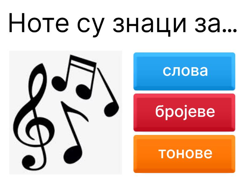 1) Ноте су знаци за... a) слова b) бројеве c) тонове 2) Нотни систем има a) 5 линија, 4 празнине b) 4 линија, 5 празнине c) 4 линије, 3 празнине 3) На почетку нотног система пише се a) виолски кључ b) музички кључ c) виолински кључ 4) црвене боје је: a) нотни врат b) нотна глава c) нотни барјачић (заставица) 5) Зелене боје је a) нотни врат b) нотна глава c) нотни барјачић(заставица) 6) Плаве боје је: a) нотни врат b) нотна глава c) нотни барјачић(заставица) 7) По трајању, ово је a) четвртина ноте b) половина ноте c) цела нота d) осмина ноте 8) Цела нота траје a) 4 откуцаја b) 1 откуцај c) 1/2 откуцаја d) 2 откуцаја 9) По трајању, ово је a) четвртина ноте b) половина ноте c) цела нота d) осмина ноте 10) Половина ноте траје a) 4 откуцаја b) 1 откуцај c) 1/2 откуцаја d) 2 откуцаја 11) По трајању, ово је a) четвртина ноте b) половина ноте c) цела нота d) осмина ноте 12) Четвртина ноте траје a) 4 откуцаја b) 1 откуцај c) 1/2 откуцаја d) 2 откуцаја 13) По трајању, ово је a) четвртина ноте b) половина ноте c) цела нота d) осмина ноте 14) Осмина ноте траје a) 4 откуцаја b) 1 откуцај c) 1/2 откуцаја d) 2 откуцаја 15) Две осмине ноте можемо да запишемо као a) b) c) 16) По трајању, ово је a) четвртина паузе b) половина паузе c) осмина паузе 17) По трајању, ово је a) четвртина паузе b) половина паузе c) осмина паузе 18) По висини тона, ово је нота a) до b) ре c) ми d) фа e) сол 19) По висини тона, ово је нота a) до b) ре c) ми d) фа e) сол 20) По висини тона, ово је нота a) до b) ре c) ми d) фа e) сол 21) По висини тона, ово је нота a) до b) ре c) ми d) фа e) сол 22) По висини тона, ово је нота a) до b) ре c) ми d) фа e) сол 23) Ово је : a) цртица b) тактица c) крај нотног текста d) знак за понављање 24) Ово је : a) цртица b) тактица c) крај нотног текста d) знак за понављање 25) Ово је : a) цртица b) тактица c) крај нотног текста d) знак за понављање 26) Део нотног текста је a) пакт b) такт c) делић 27) Ова ознака значи a) певај две четвртине b) двочетвртински такт c) две четвртине ноте