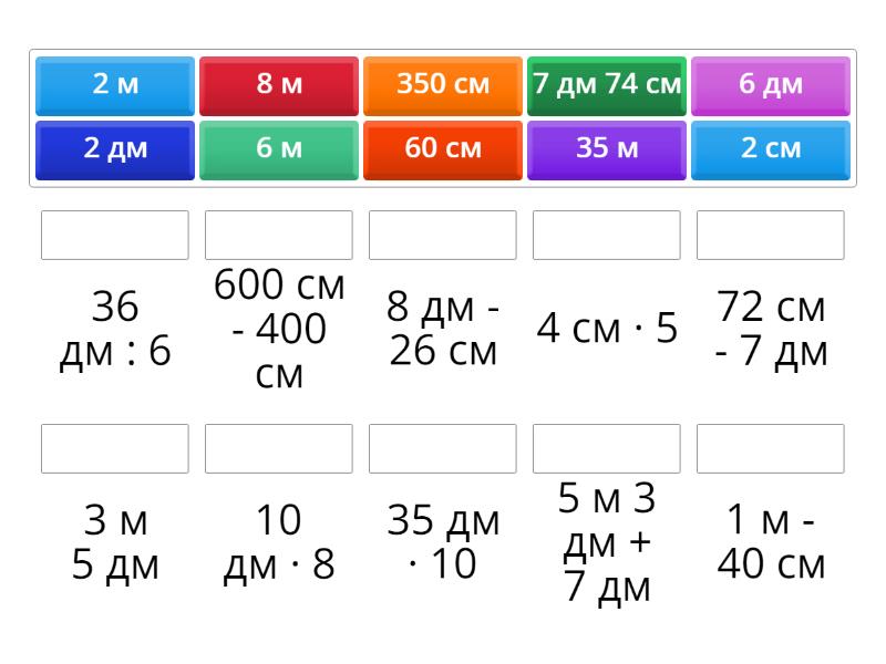 350 см - 3 м 5 дм , 6 м - 5 м 3 дм + 7 дм, 60 см - 36 дм : 6, 35 м - 35 дм · 10 , 7 дм 74 см - 8 дм - 26 см, 6 дм - 1 м - 40 см, 2 см - 72 см - 7 дм, 2 дм - 4 см · 5, 8 м - 10 дм · 8, 2 м - 600 см - 400 см,