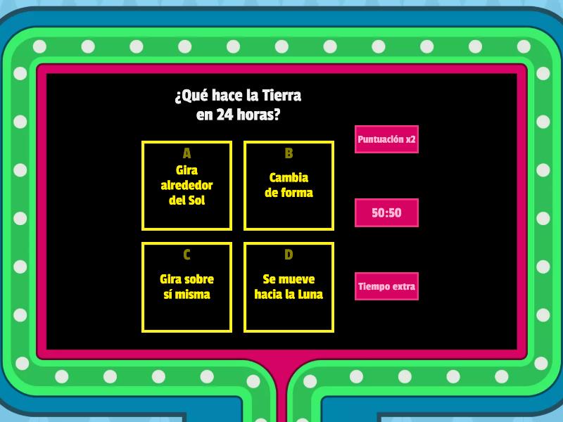 1) ¿Qué hace la Tierra en 24 horas? a) Gira alrededor del Sol b) Cambia de forma c) Gira sobre sí misma d) Se mueve hacia la Luna 2) ¿Dónde vemos el sol al mediodía? a) No se puede ver b) Muy bajo en el cielo c) Muy arriba en el cielo 3) ¿Por qué tenemos día y noche? a) Porque la Luna tapa el Sol b) Porque la Tierra gira sobre sí misma c) Porque el Sol se apaga d) Porque cambiamos de planeta 4) ¿Qué es la translación de la Tierra? a) Cambiar de color b) Girar sobre sí misma c) Moverse alrededor del Sol d) Saltar en el espacio 5) ¿Qué genera la translación de la Tierra? a) La Tierra redonda b) Los cambios de la luna c) El día y la noche d) Las estaciones 6) ¿Cómo se llama cuando la Luna da una vuelta completa alrededor de la Tierra? a) Rotación b) Translación c) Salto lunar d) Paseo lunar 7) ¿Qué forma tiene la Tierra? a) Plana como un plato b) Cuadrada como una caja c) Redonda como una pelota d) Triangular como una pirámide 8) ¿Qué vemos en el cielo durante la noche? a) El Sol b) Muchas nubes c) Estrellas y a veces la Luna d) Arcoíris 9) ¿Cuánto tiempo tarda la Tierra en dar una vuelta completa alrededor del Sol? a) Un día b) Una semana c) Un mes d) Un año 10) ¿Qué vemos en el cielo cuando amanece? a) La Luna b) El Sol apareciendo c) Estrellas d) Planetas 11) ¿Dónde está el Sol al atardecer? a) No se ve b) Arriba, alto en el cielo c) Abajo en el horizonte 12) ¿Cuántas veces al día la Tierra gira sobre sí misma? a) Dos veces b) Cuatro veces c) Una vez d) Tres veces 13) ¿Qué causa las estaciones del año? a) La Luna b) La distancia de la Tierra al Sol c) La rotación de la Tierra d) El movimiento de translación de la Tierra 14) ¿Cómo se llama esta fase de la Luna ? a) Luna nueva b) Cuarto creciente c) Cuarto menguante d) Luna llena 15) ¿Qué pasa con las plantas y los animales en diferentes estaciones? a) Siempre son iguales b) Cambian de color c) Cambian su comportamiento y aspecto d) Se van a otros planetas 16) ¿En qué fase de la Luna no podemos verla en el cielo? a) Luna llena b) Cuarto creciente c) Luna nueva d) Cuarto menguante 17) ¿Cómo se llama esta fase de la Luna ? a) Luna llena b) Cuarto creciente c) Luna nueva d) Cuarto menguante 18) ¿Por qué es importante el Sol para la Tierra? a) Porque hace bonito en el cielo b) Porque nos da luz y calor c) Porque suena como música d) Porque gira alrededor de la Tierra