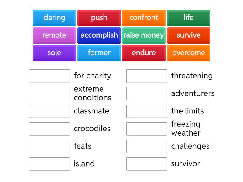 daring - adventurers, overcome - challenges, push - the limits, raise money - for charity, remote - island, former - classmate, endure - freezing weather, confront - crocodiles, survive - extreme conditions, life - threatening, sole - survivor, accomplish - feats,