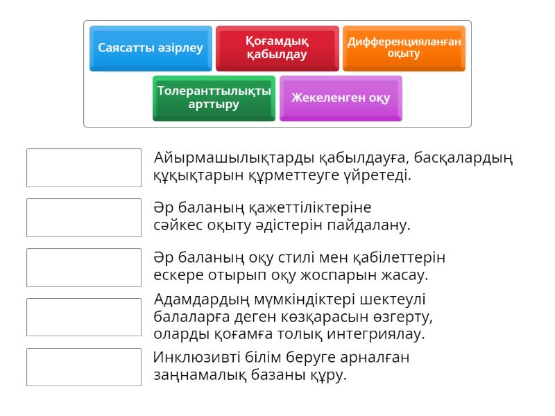 Дифференцияланған оқыту - Әр баланың қажеттіліктеріне сәйкес оқыту әдістерін пайдалану., Жекеленген оқу - Әр баланың оқу стилі мен қабілеттерін ескере отырып оқу жоспарын жасау., Саясатты әзірлеу - Инклюзивті білім беруге арналған заңнамалық базаны құру., Толеранттылықты арттыру - Айырмашылықтарды қабылдауға, басқалардың құқықтарын құрметтеуге үйретеді., Қоғамдық қабылдау - Адамдардың мүмкіндіктері шектеулі балаларға деген көзқарасын өзгерту, оларды қоғамға толық интегриялау.,