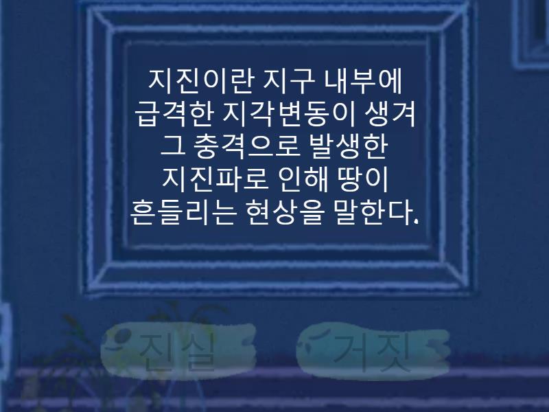 진실: 지진이란 지구 내부에 급격한 지각변동이 생겨 그 충격으로 발생한 지진파로 인해 땅이 흔들리는 현상을 말한다., 진원이란 지구 내부에서 지진이 발생한 지점이다., 지진조기경보는 상대적으로 피해가 큰 지진파(S파)가 도달 전에 속도가 빠른 지진파(P파)를 이용해 알려주는 원리이다., 지진파 중 P파가 S파에 비해 빠르게 전파된다., 지진이 발생하면 신발을 꼭 신고 대피한다., P파는 종파, S파는 횡파이다., 지진대는 판의 경계와 거의 일치한다., 거짓: 지진의 '진도'란 지진이 가지고 있는 절대적인 에너지의 크기이다., 지진 대피 시 밖으로 나오면 건물이나 담장 옆에 붙어서 대피한다., 판의 경계에 인접한 지역은 지진으로부터 비교적 안전하다., 우리나라는 판의 경계에 인접해 있기 때문에 지진 발생 빈도가 낮은 편이다., 지진은 발생하기 전에 예측할 수 있다.,