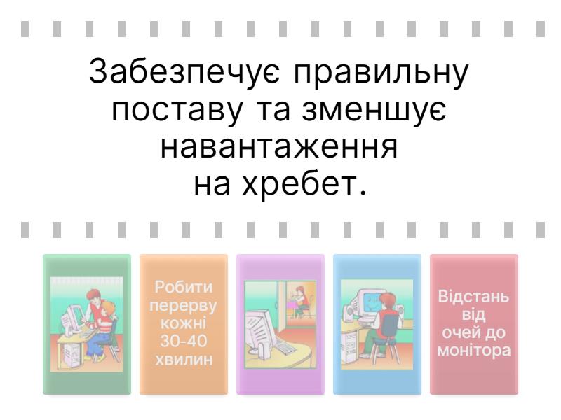 Забезпечує правильну поставу та зменшує навантаження на хребет., Відстань від очей до монітора, Робити перерву кожні 30-40 хвилин - Допомагає уникнути перевтоми., Запобігає ураженню електричним струмом., Уникає ризику пошкодження обладнання.,
