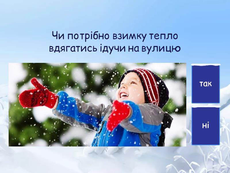 1) Чи потрібно взимку тепло вдягатись ідучи на вулицю a) так b) ні 2) На дворі треба... a) всього боятись b) поводитись спокійно та впевнено c) поводитись агресивно 3) Чи можна гратися із вогнем і петардами? a) так b) ні 4) Якщо незнайомець підійде до Вас, і запропонує підвезти додому... a) подякуєш і поїдеш із ним b) Подякуєш, та відмовишся 5) Чи можна кататися на санчатах по дорозі де їздять автомобілі? a) так b) ні 6) Чи можна ходити з друзями на ковзанку? a) так b) ні 7) Чи можна кататися на ковзанці на тонкій кризі? a) так b) ні 8) Можна переходити дорогу через пішохідний перехід? a) так b) ні 9) Чи треба слухатися батьків ? a) так b) ні 10) Чи можна їсти забагато солодощів? a) так b) ні 11) Чи потрібно остерігатися незнайомих предметів? a) так b) ні 12) Коли чуєте сигнал повітряної тривоги, чи потрібно йти в укриття чи за дві стіни? a) так b) ні 13) Чи можна відкривати двері незнайомцям? a) так b) ні 14) Чи можна гратися з бродячими тваринами? a) так b) ні 15) Чи можна весь час проводити за іграми на гаджетах a) так b) ні