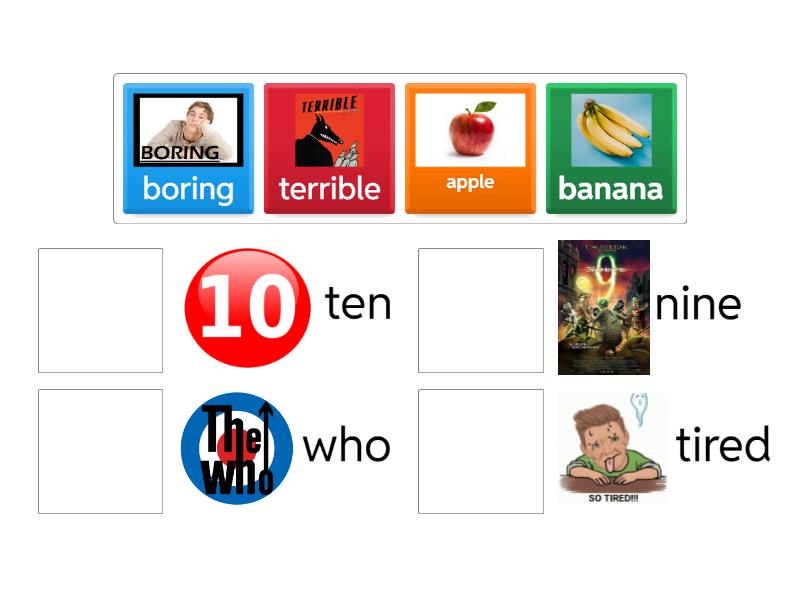 apple - tired, banana - nine, terrible - ten, boring - who,