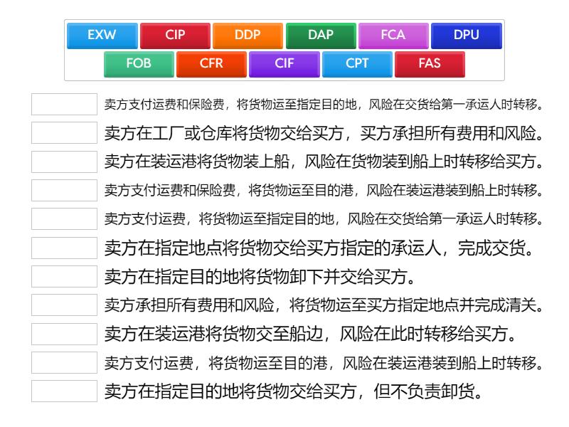 根据不同贸易术语的特点,和相关贸易术语的解释配对