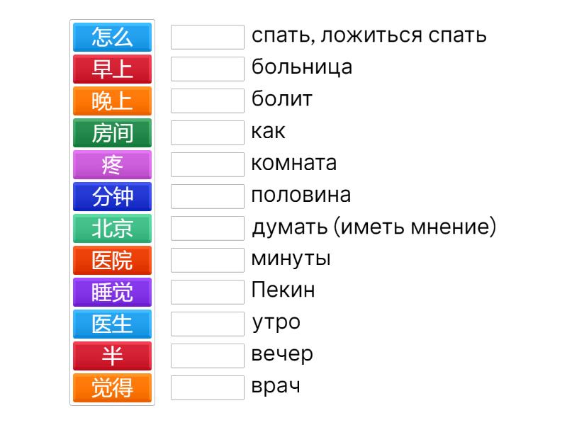 疼 - болит, 半 - половина, 早上 - утро, 医院 - больница, 医生 - врач, 怎么 - как, 房间 - комната, 睡觉 - спать, ложиться спать, 觉得 - думать (иметь мнение), 晚上 - вечер, 分钟 - минуты, 北京 - Пекин,