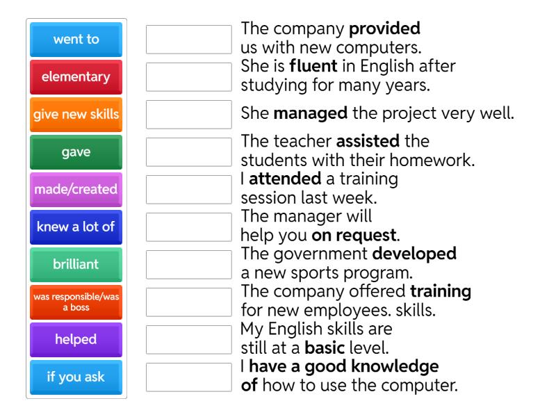helped - The teacher assisted the students with their homework., was responsible/was a boss - She managed the project very well., went to - I attended a training session last week., elementary - My English skills are still at a basic level., made/created - The government developed a new sports program., gave - The company provided us with new computers., brilliant - She is fluent in English after studying for many years., if you ask - The manager will help you on request., knew a lot of - I have a good knowledge of how to use the computer., give new skills - The company offered training for new employees. skills.,