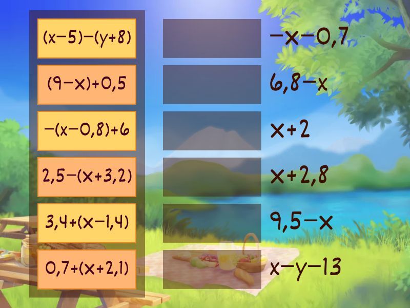 0,7+(х+2,1) - х+2,8, (9−х)+0,5 - 9,5−х, −(x−0,8)+6 - 6,8−x, 2,5−(х+3,2) - −х−0,7, (x−5)−(y+8) - x−y−13, 3,4+(х−1,4) - х+2,