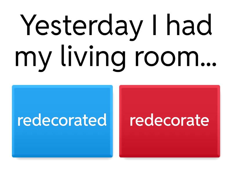 1) Yesterday I had my living room... a) redecorated b) redecorate 2) My mom got my sister...her bedroom. a) clean b) to clean 3) The teacher ... his students to print the exams. a) got b) had 4) My brother got his friend to ... his laptop. a) fix b) fixed 5) I got my son... a) to make dinner b) to make homework. 6) My sister ... her phone stolen 2 days ago. She got shocked after the robbery. a) got b) had 7) My friend ... me to help him with his housework. a) got b) get 8) My boss always ... me send emails to everyone. a) has b) have